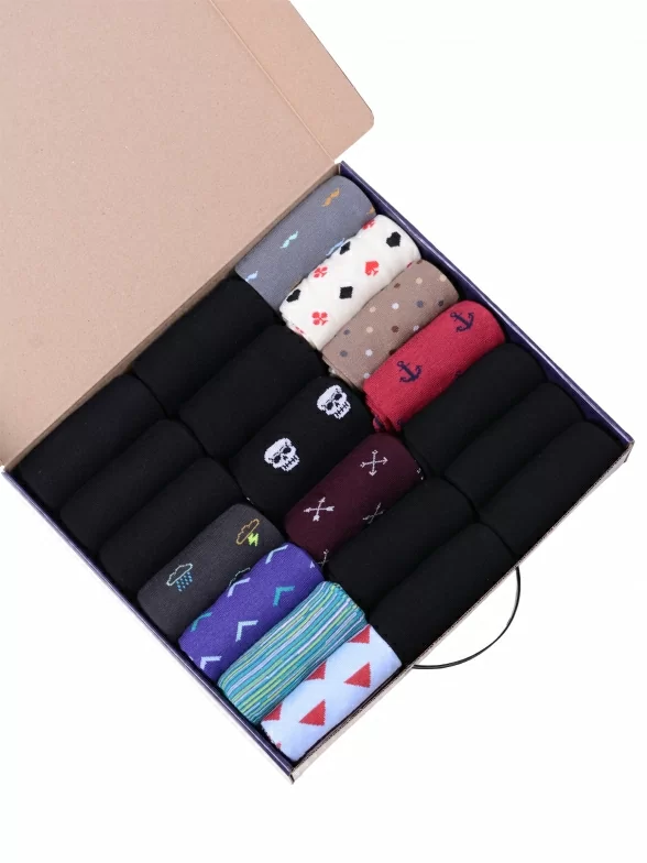 В этот набор мужских носков MSCLUB входят входят 10 пар в классическом черном цвете и 10 пар ярких носков с различными принтами, которые подойдут для любого повседневного образа.