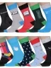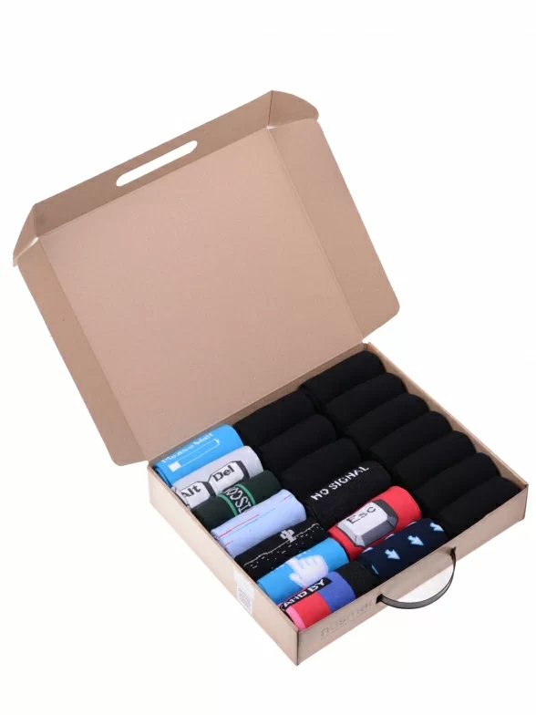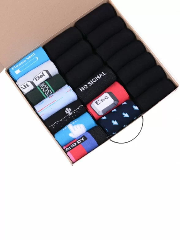В этот набор мужских носков MSCLUB входят входят 10 пар в классическом черном цвете и 10 пар ярких носков с различными принтами, которые подойдут для любого повседневного образа.