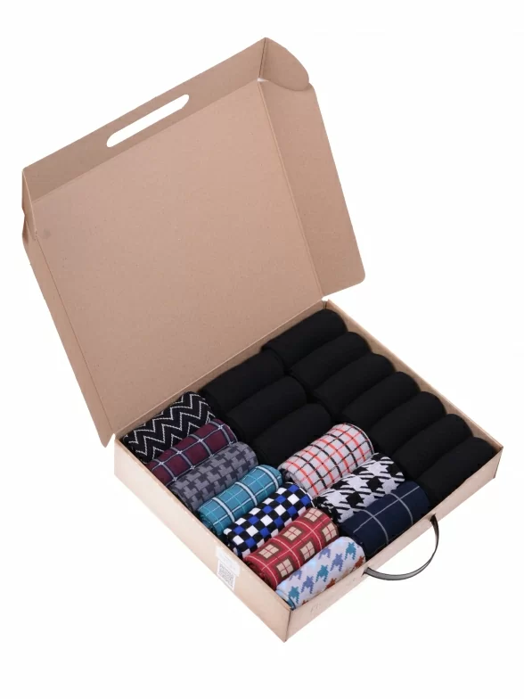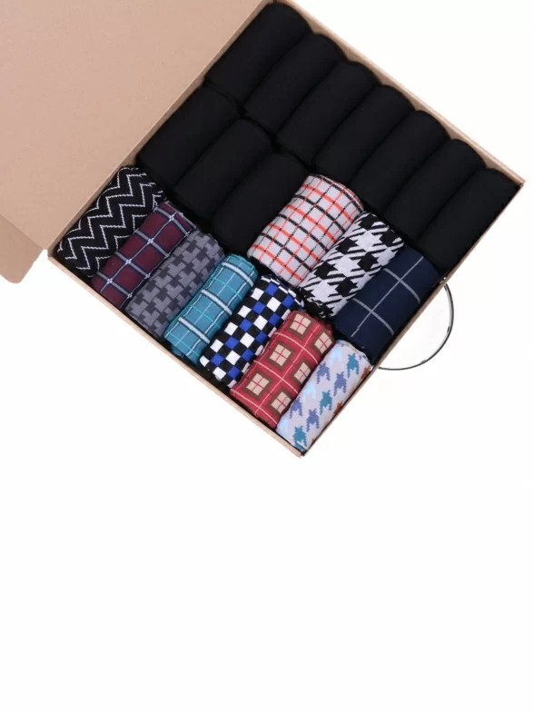 В этот набор мужских носков MSCLUB входят входят 10 пар в классическом черном цвете и 10 пар ярких носков с различными принтами, которые подойдут для любого повседневного образа.
