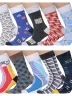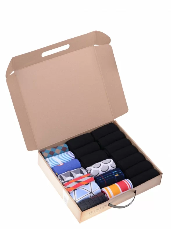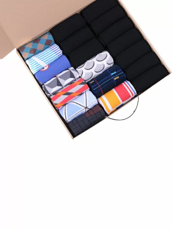 В этот набор мужских носков MSCLUB входят входят 10 пар в классическом черном цвете и 10 пар ярких носков с различными принтами, которые подойдут для любого повседневного образа.