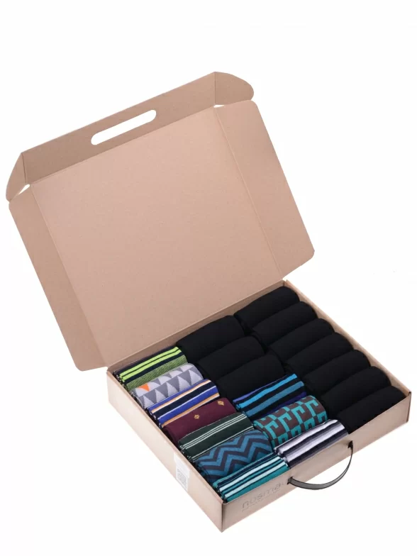 В этот набор мужских носков MSCLUB входят входят 10 пар в классическом черном цвете и 10 пар ярких носков с различными принтами, которые подойдут для любого повседневного образа.