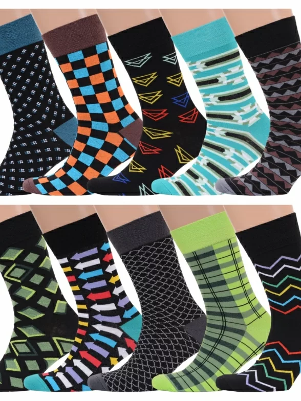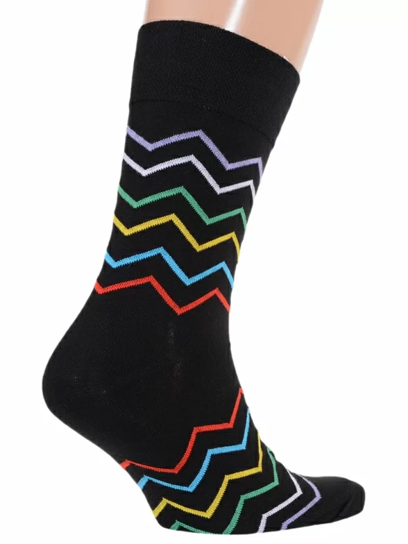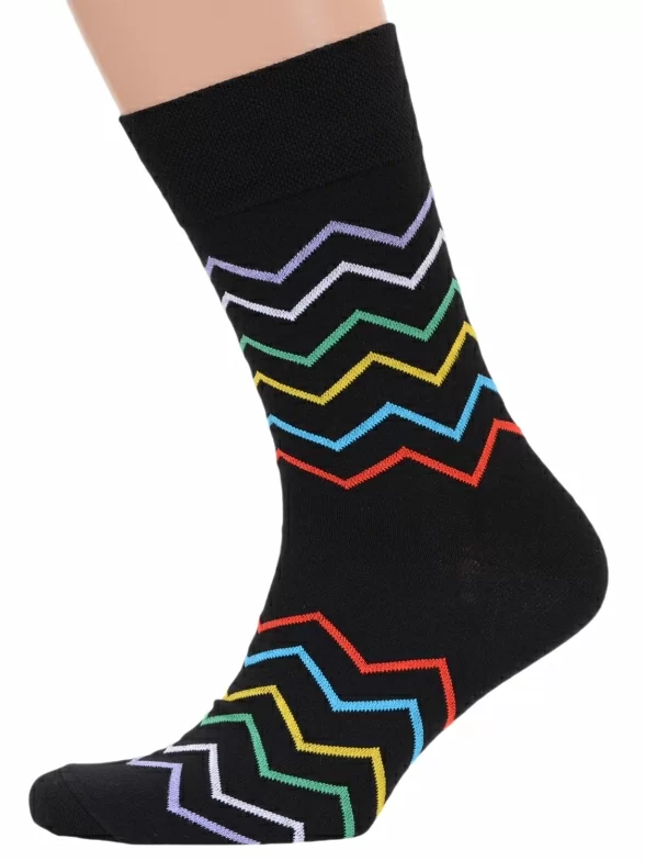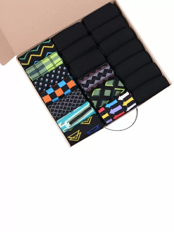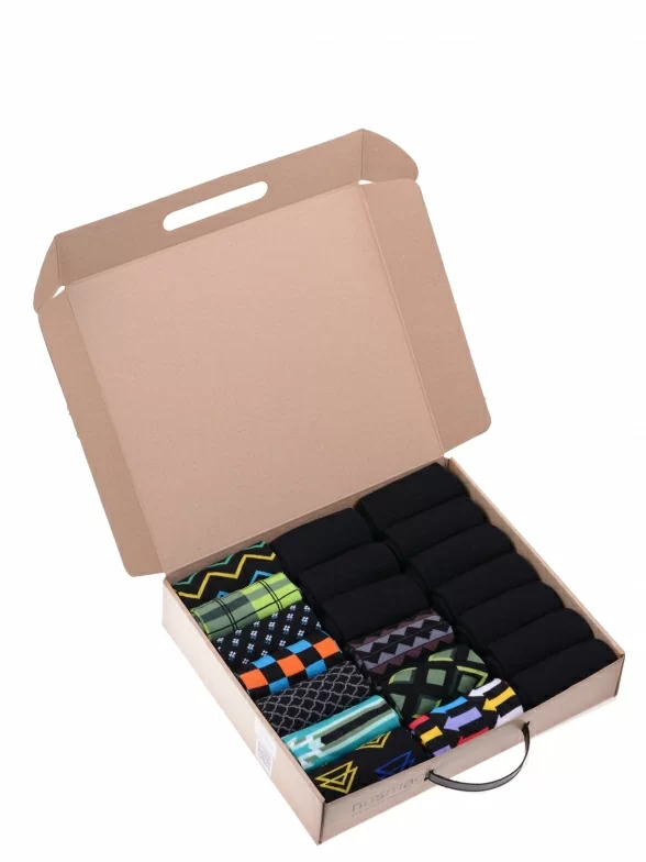 В этот набор мужских носков MSCLUB входят входят 10 пар в классическом черном цвете и 10 пар ярких носков с различными принтами, которые подойдут для любого повседневного образа.
