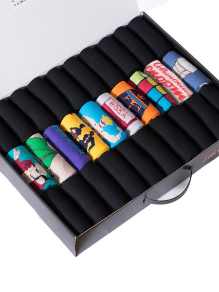 Носки компактно свернуты в аккуратные рулончики внутри стильной фирменной коробки.