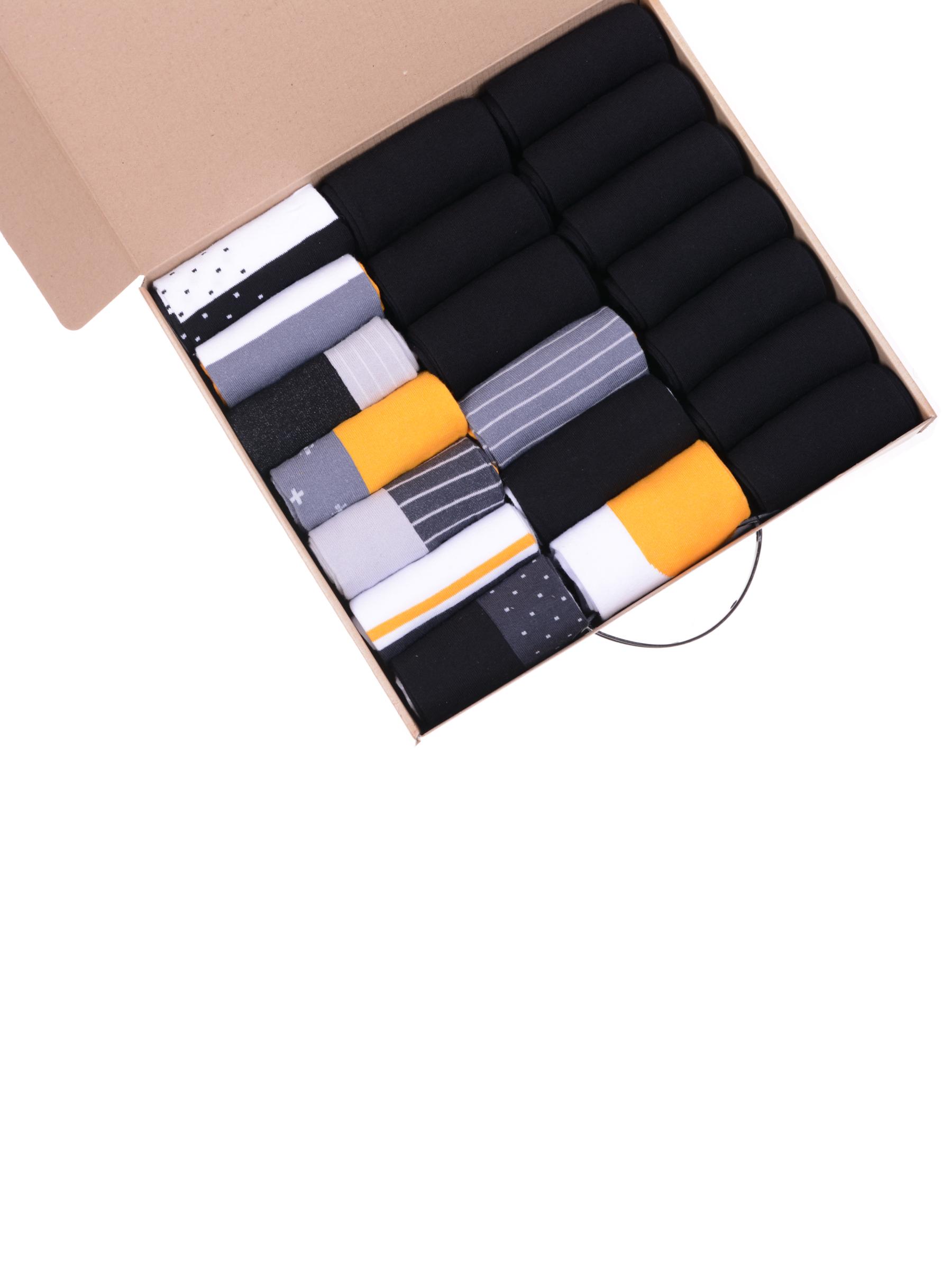 В этот набор мужских носков MSCLUB входят входят 10 пар в классическом черном цвете и 10 пар ярких носков с различными принтами, которые подойдут для любого повседневного образа.