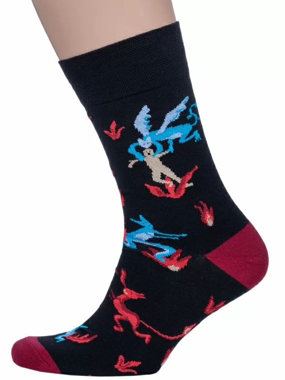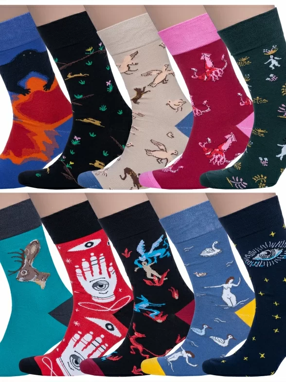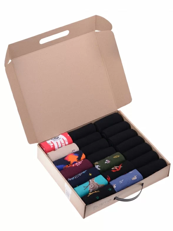 В этот набор мужских носков MSCLUB входят входят 10 пар в классическом черном цвете и 10 пар ярких носков с различными принтами, которые подойдут для любого повседневного образа.
