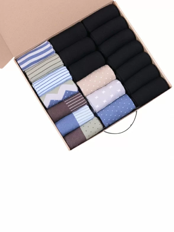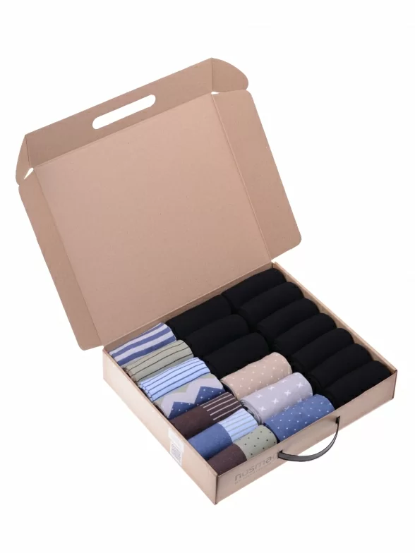 В этот набор мужских носков MSCLUB входят входят 10 пар в классическом черном цвете и 10 пар ярких носков с различными принтами, которые подойдут для любого повседневного образа.