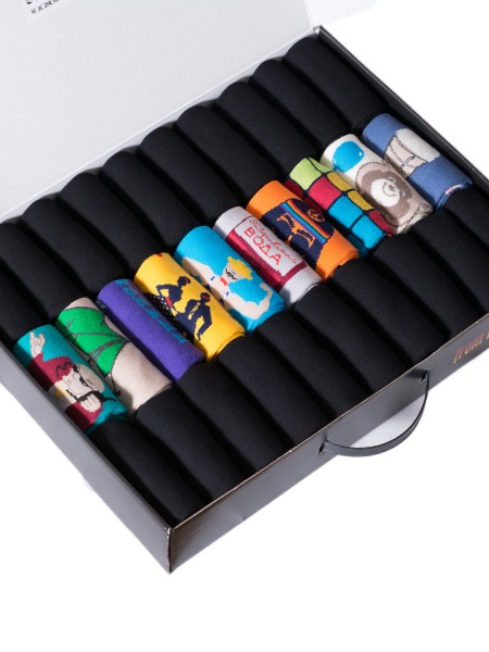 Носки свернуты в аккуратные рулончики внутри фирменного кейса. А чтобы он не потерся и не повредился при доставке, набор надежно упаковывается в транспортный плотный картон.