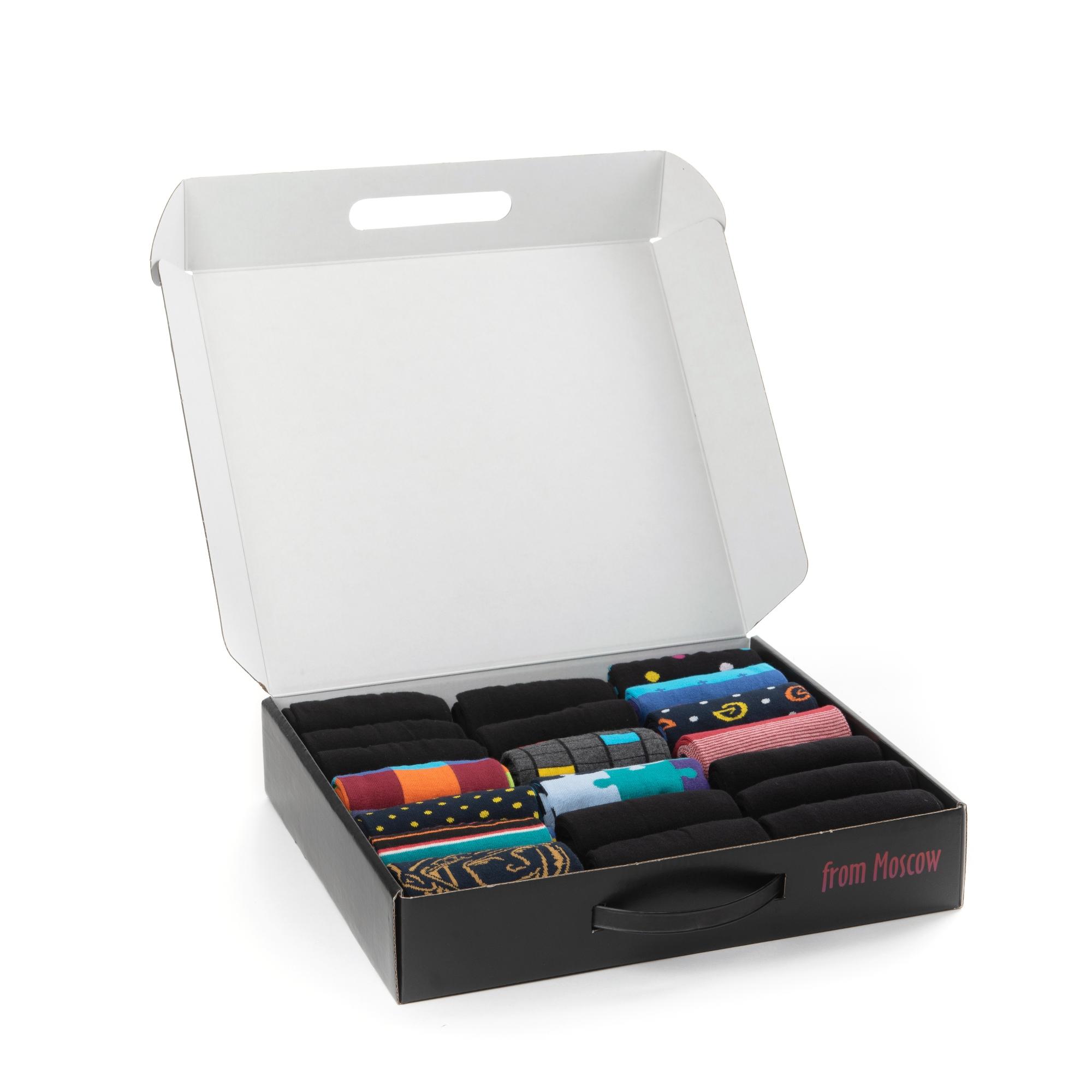 В этот набор мужских носков MSCLUB входят входят 10 пар в классическом черном цвете и 10 пар ярких носков с различными принтами, которые подойдут для любого повседневного образа.