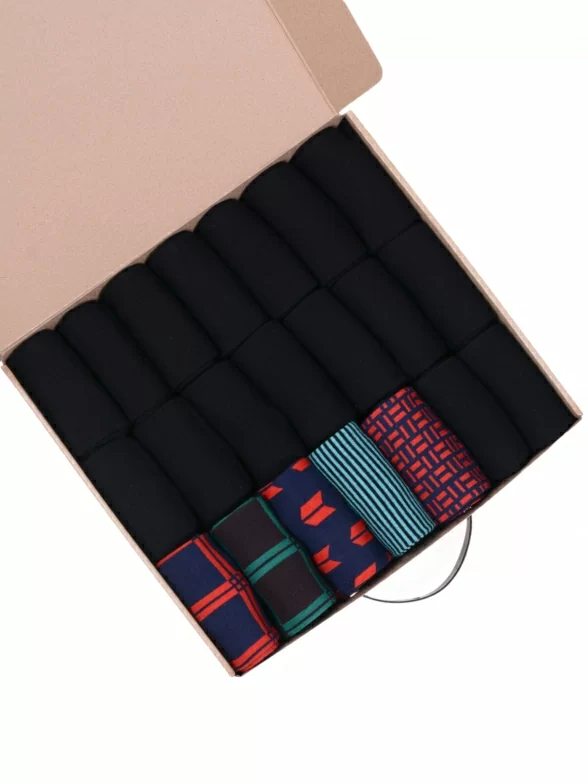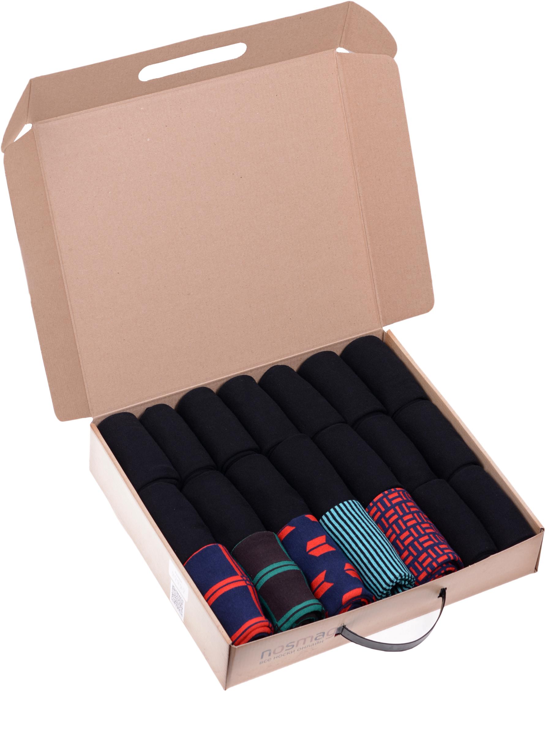 В этот набор мужских носков входят входят 16 пар в классическом черном цвете и 5 пар ярких носков с различными принтами, которые подойдут для любого повседневного образа.