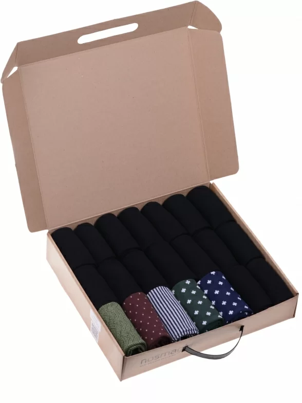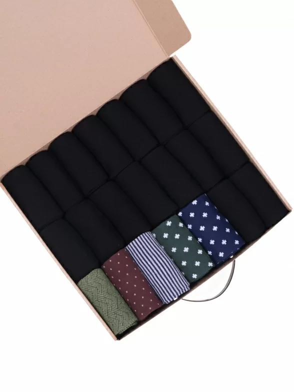 В этот набор мужских носков входят входят 16 пар в классическом черном цвете и 5 пар ярких носков с различными принтами, которые подойдут для любого повседневного образа.