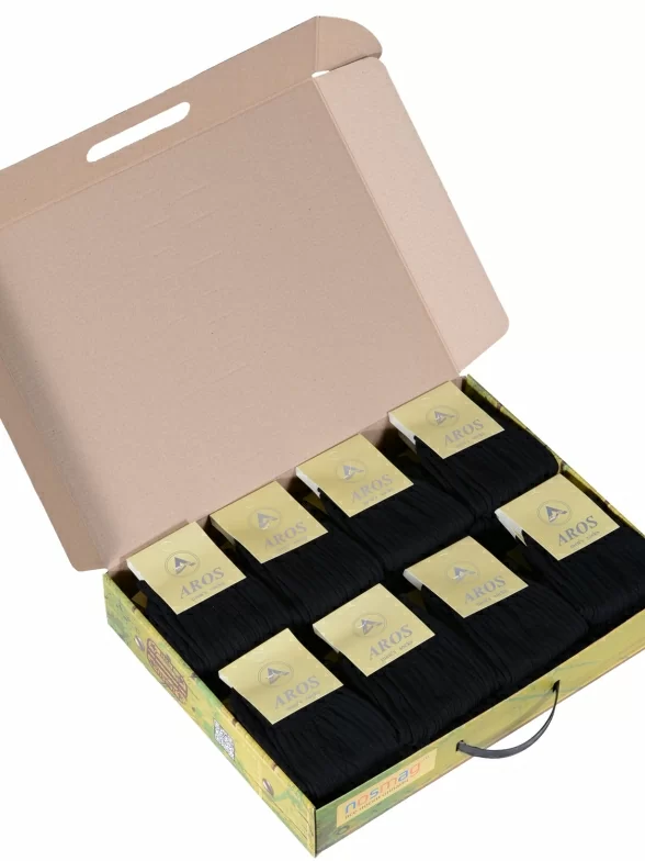 В набор входит 24 пары однотонных черных носков. Каждая пара имеет индивидуальную заводскую этикетку. Носки компактно упакованы в красивый подарочный кейс.