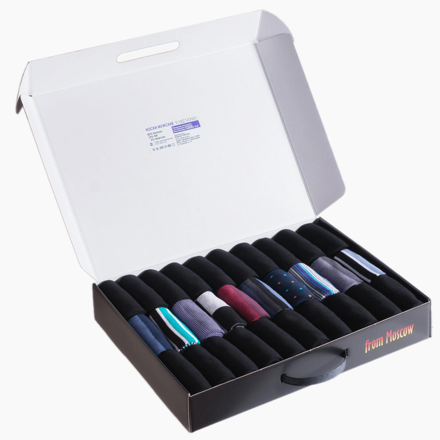 Носки свернуты в аккуратные рулончики внутри фирменного кейса. А чтобы он не потерся и не повредился при доставке, набор надежно упаковывается в транспортный плотный картон.