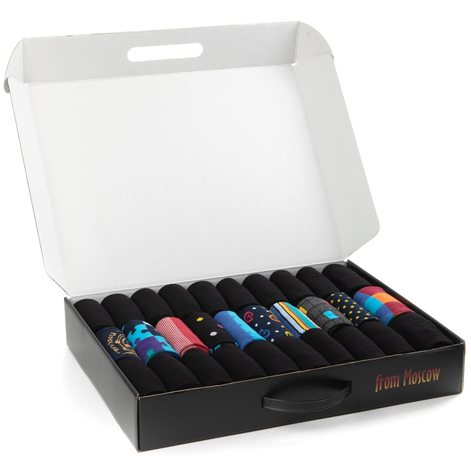 В наборе 20 пар черных однотонных и 10 пар цветных носков с разнообразным принтом - горох, полоска, клетка, абстракция и даже фантастические носки с изображением первого человека в космосе - легендарным Юрием Гагариным. Такой набор станет отличным подарком на любой праздник или выгодной покупкой для себя лично, ведь покупая носки упаковкой вы экономите приличную сумму денег.