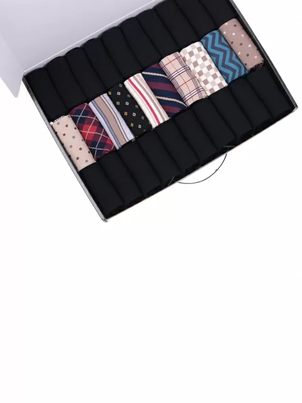 В этот набор мужских носков MSCLUB входят входят 20 пар в классическом черном цвете и 10 пар ярких носков с различными принтами, которые подойдут для любого повседневного образа.