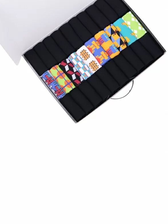 В этот набор мужских носков MSCLUB входят входят 20 пар в классическом черном цвете и 10 пар ярких носков с различными принтами, которые подойдут для любого повседневного образа.