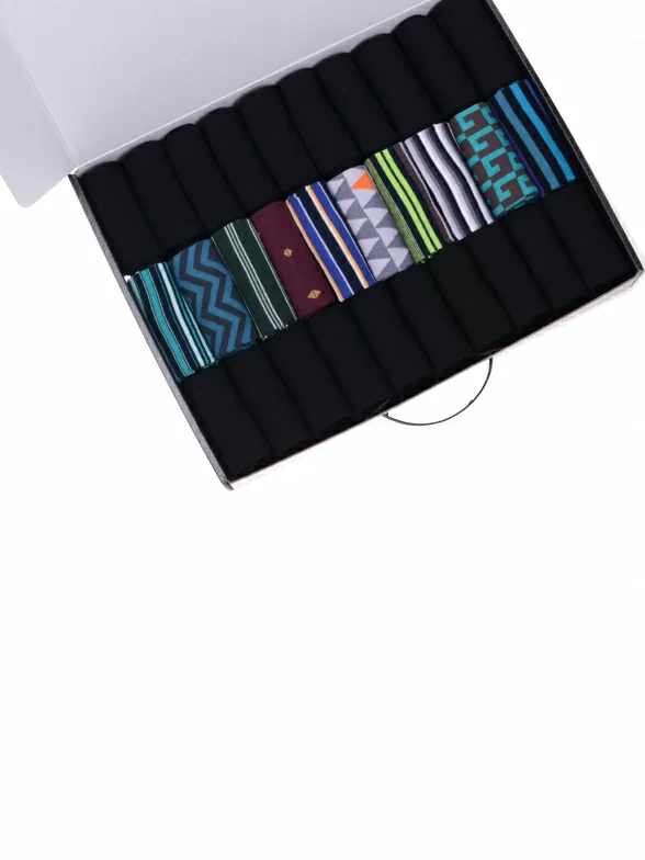 В этот набор мужских носков MSCLUB входят входят 20 пар в классическом черном цвете и 10 пар ярких носков с различными принтами, которые подойдут для любого повседневного образа.