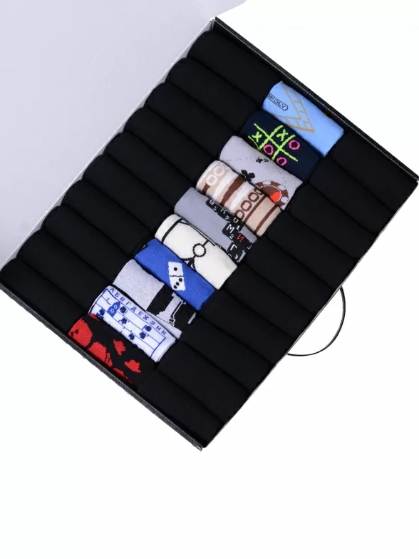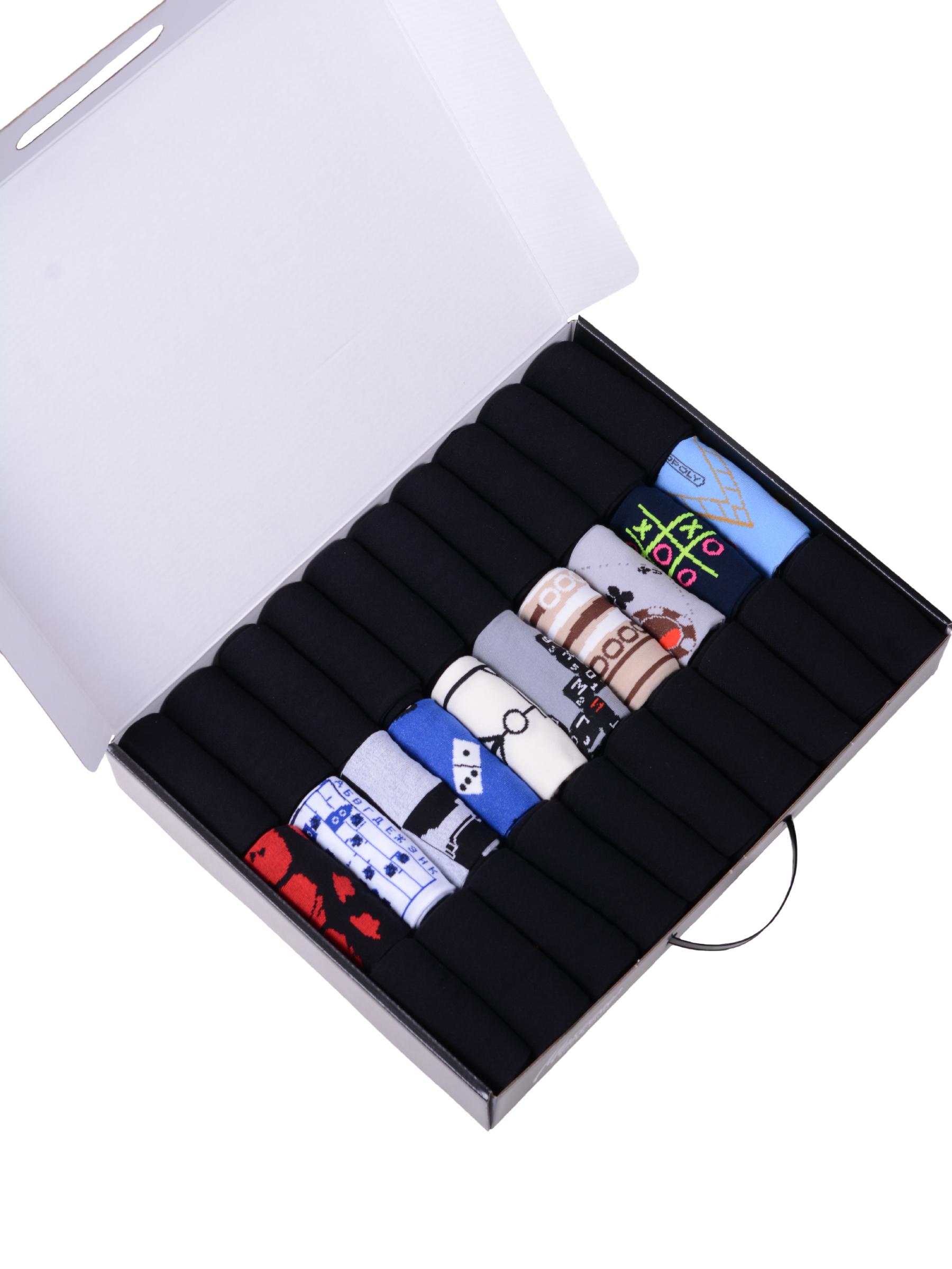 В этот набор мужских носков MSCLUB входят входят 20 пар в классическом черном цвете и 10 пар ярких носков с различными принтами, которые подойдут для любого повседневного образа.