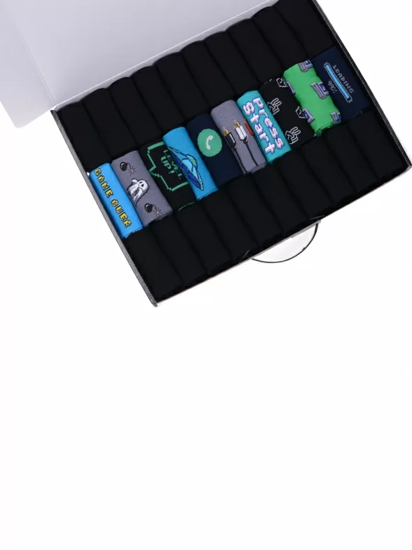Носки компактно свернуты в аккуратные рулончики внутри фирменного кейса. Для сохранности внешнего вида при транспортировке набор упаковывается в плотный картон.
