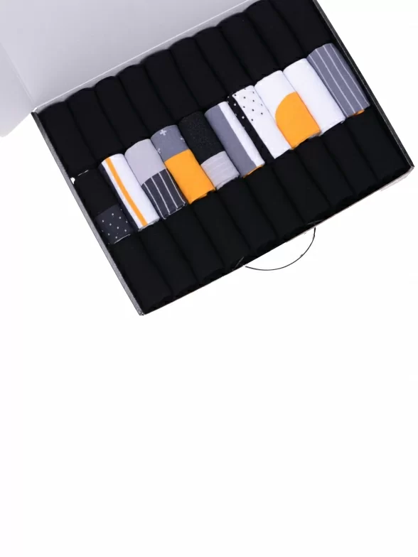Носки компактно свернуты в аккуратные рулончики внутри фирменного кейса. Для сохранности внешнего вида при транспортировке набор упаковывается в плотный картон.