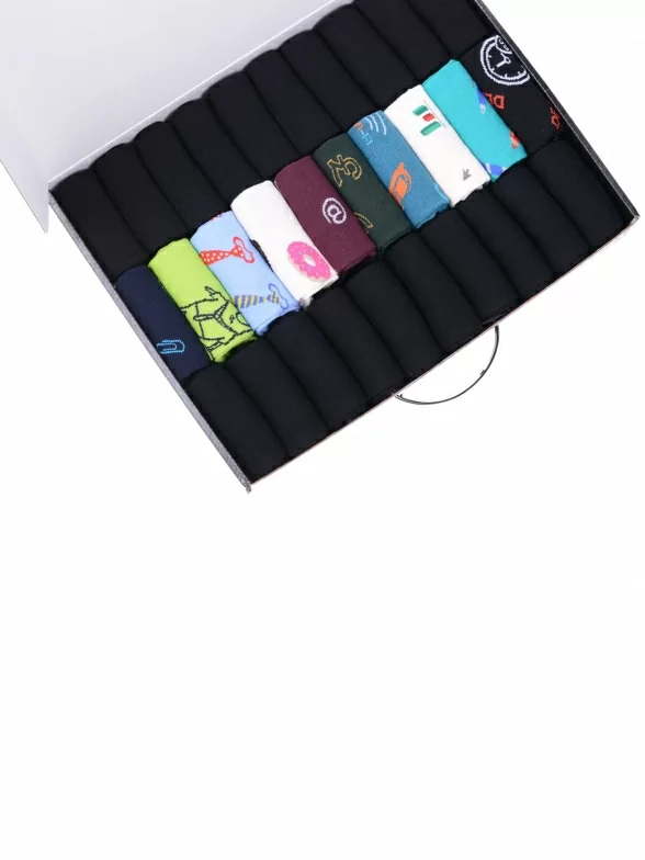 В этот набор мужских носков MSCLUB входят входят 20 пар в классическом черном цвете и 10 пар ярких носков с различными принтами, которые подойдут для любого повседневного образа.