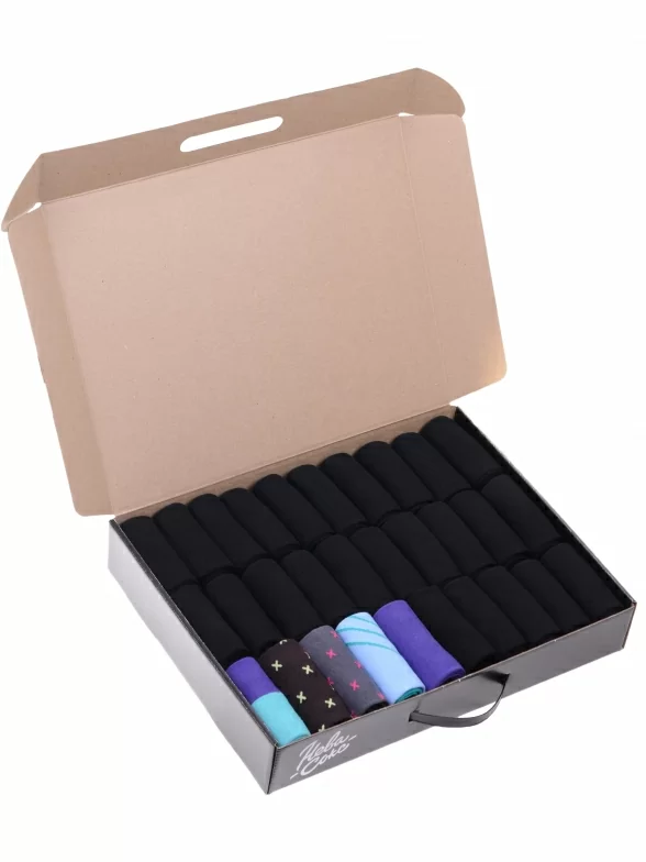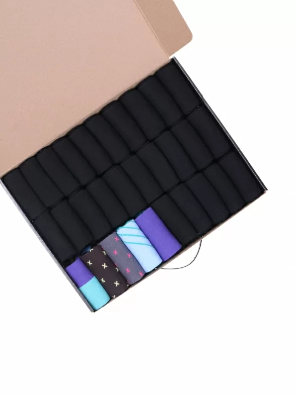 В этот набор мужских носков входят входят 25 пар в классическом черном цвете и 5 пар ярких носков с различными принтами, которые подойдут для любого повседневного образа.