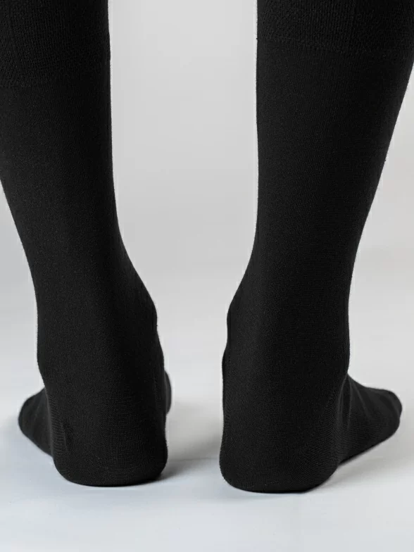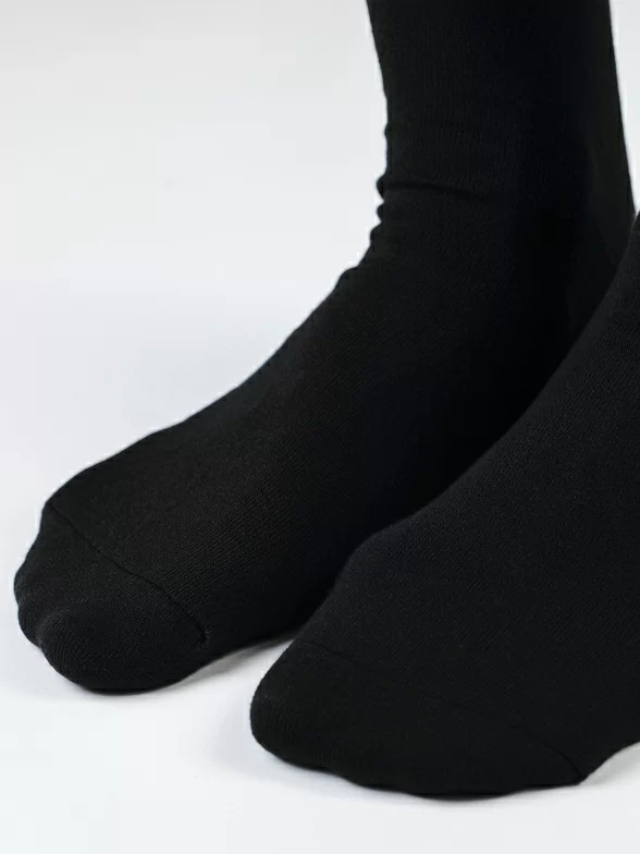 Носки вяжутся на российской фабрике на современных станках высокого класса (с плотностью вязки в 200 игл). Благодаря качественному оборудованию и оптимальному сочетанию гребенного хлопка и синтетических нитей эти носки износостойкие, гладкие и плотные. Двойной широкий борт не пережимает ногу, при этом надежно фиксирует носок на голени.