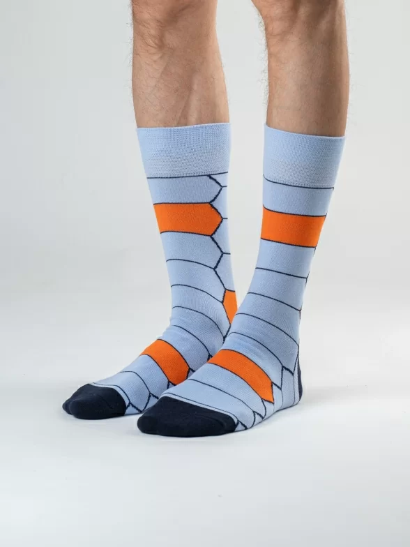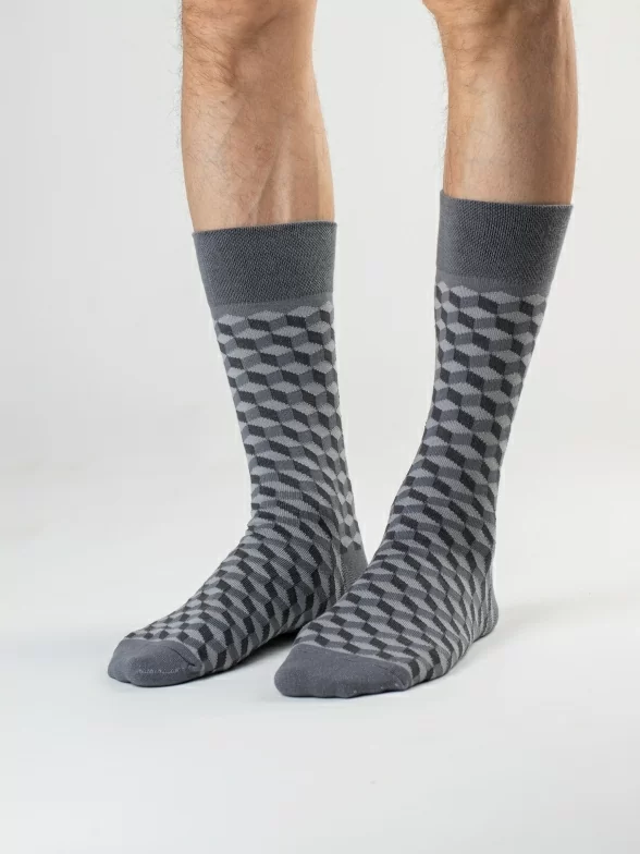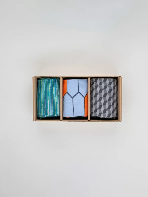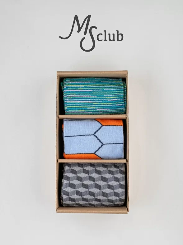 В этот набор "Небесная черепаха" входит 3 пары мужских носков с различными геометрическими принтами, которые подойдут для любого повседневного образа.