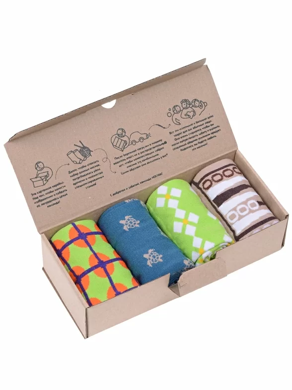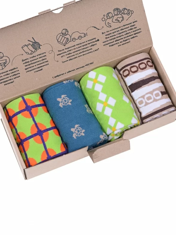 Носки аккуратными рулончиками без фабричных этикеток упакованы в плотную крафтовую коробку, которая в целях бережного отношения к природе отправляется без дополнительной транспортной упаковки.