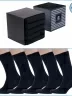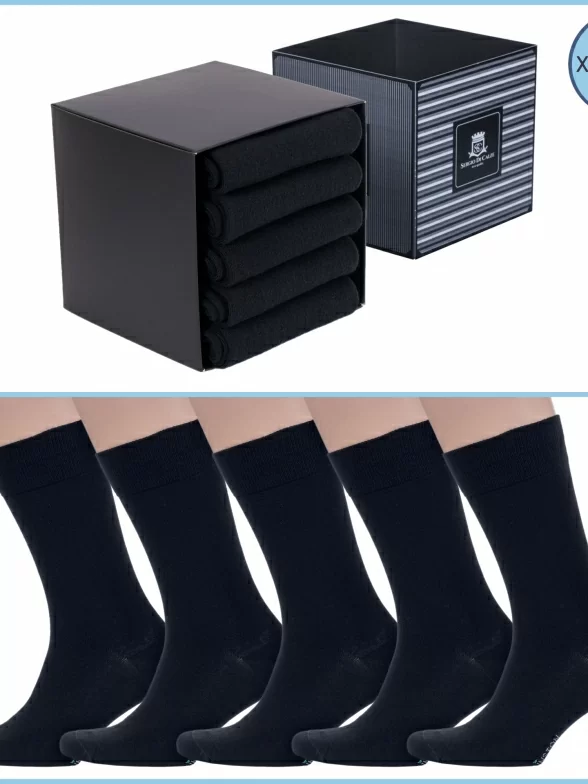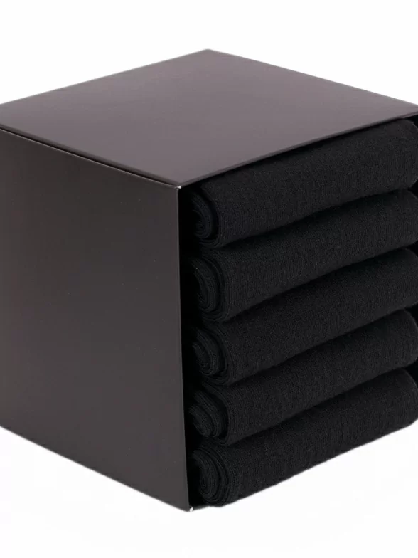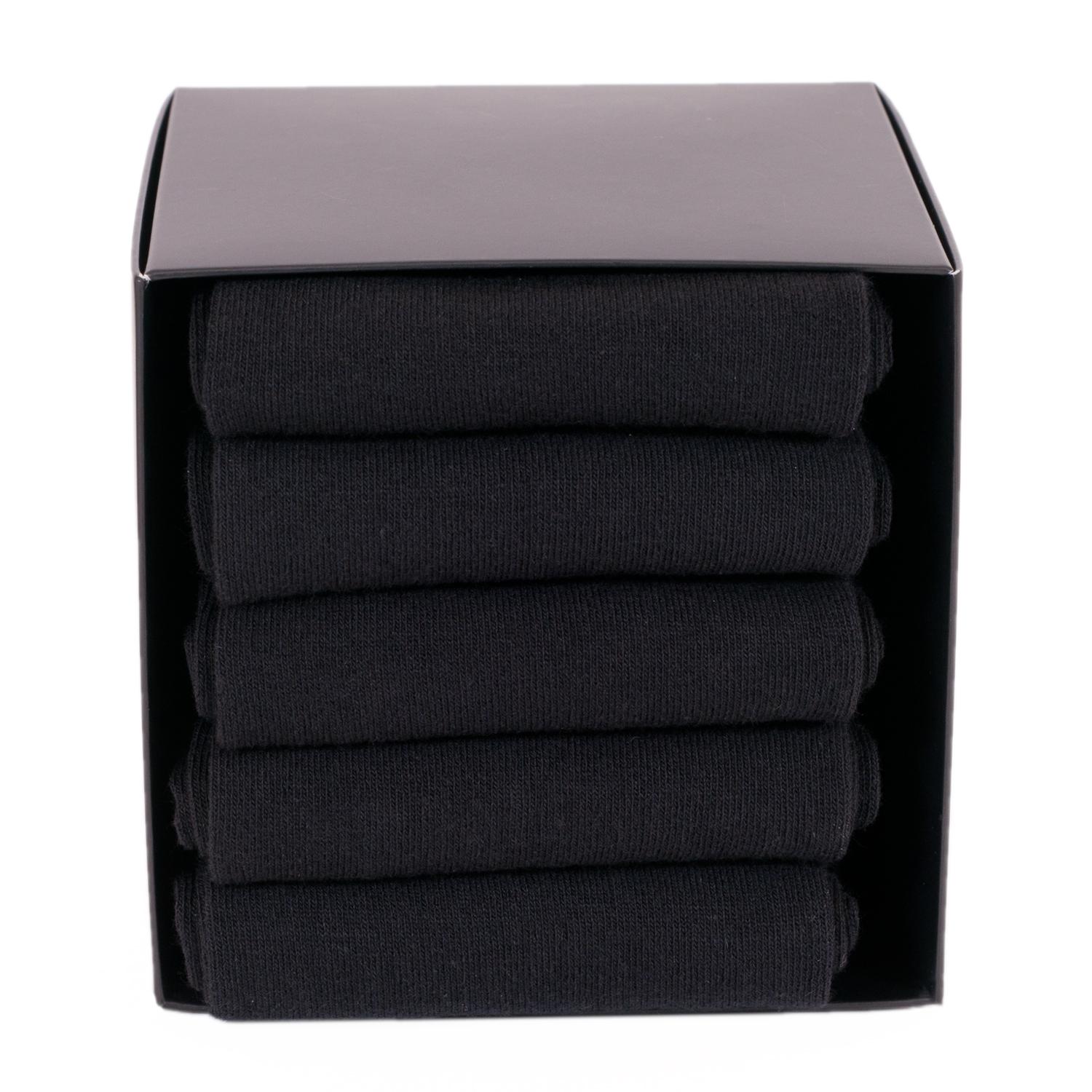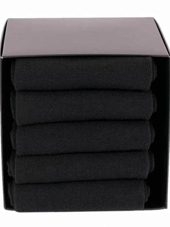 Набор состоит из 5 пар черных носков артикула 17D1, сложенных с индивидуальными фабричными этикетками в фирменную коробку-кубик, которая дополнительно упакована в плотный транспортный картон для сохранности при доставке.