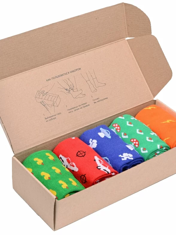 Носки без фабричных этикеток компактно свернуты рулончиками внутри крафтовой фирменной коробки, которая в целях бережного отношения к природе отправляется без дополнительной упаковки.