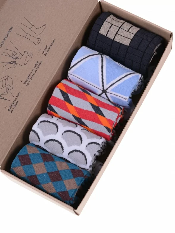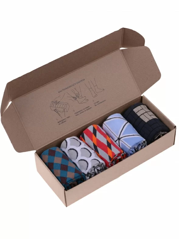 Набор мужских качественных носков пригодится каждому мужчине любого возраста. В комплект входит 5 разных пар носков с различными принтами.