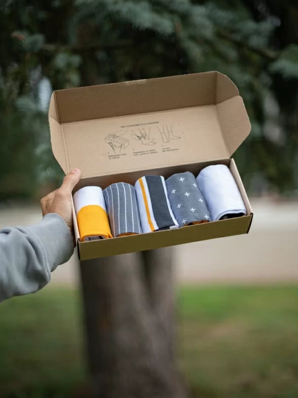 Носки аккуратными рулончиками без фабричных этикеток упакованы в плотную крафтовую коробку, которая в целях бережного отношения к природе отправляется без дополнительной транспортной упаковки.