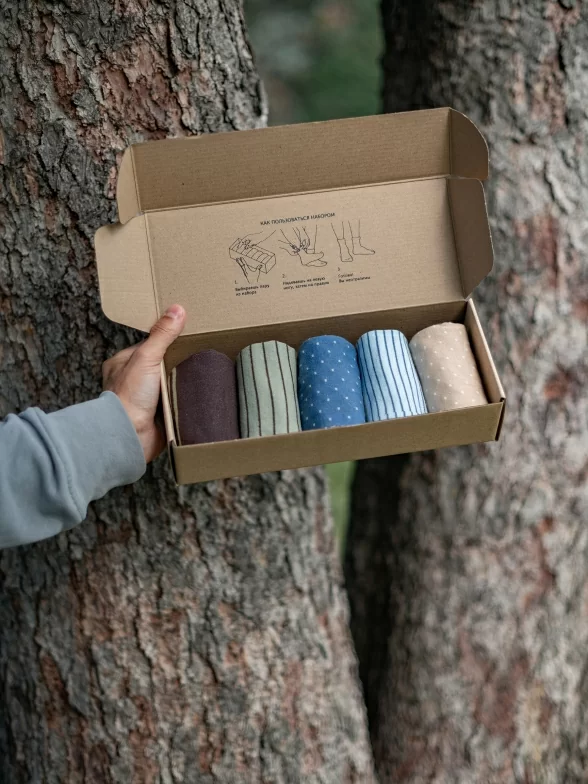 Носки аккуратными рулончиками без фабричных этикеток упакованы в плотную крафтовую коробку, которая в целях бережного отношения к природе отправляется без дополнительной транспортной упаковки.