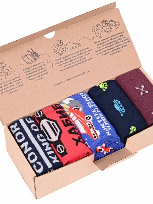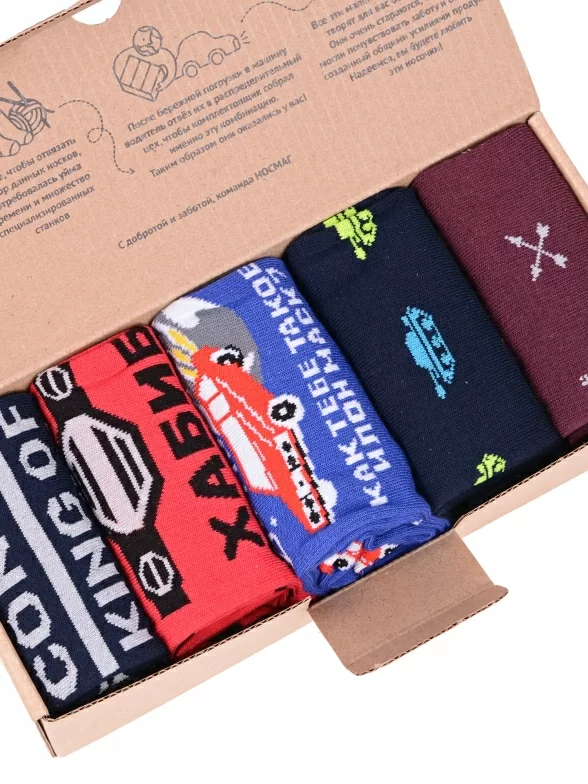 Носки аккуратными рулончиками без фабричных этикеток упакованы в плотную крафтовую коробку, которая в целях бережного отношения к природе отправляется без дополнительной транспортной упаковки.