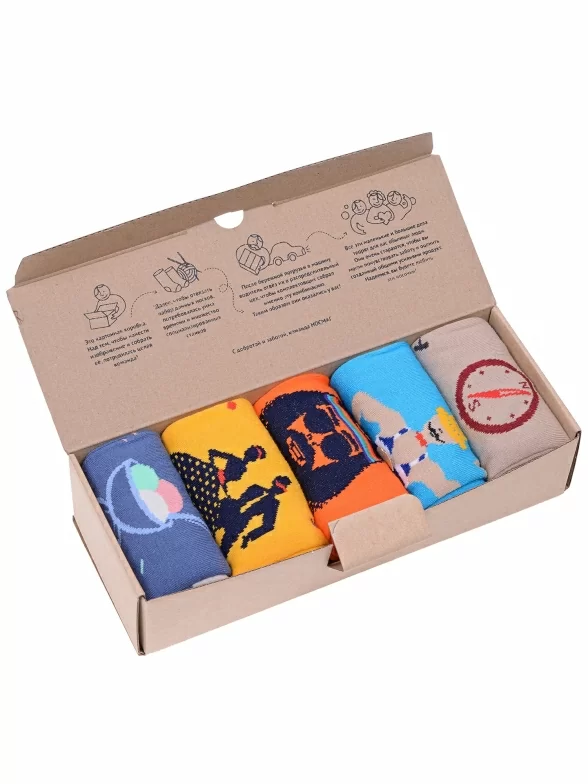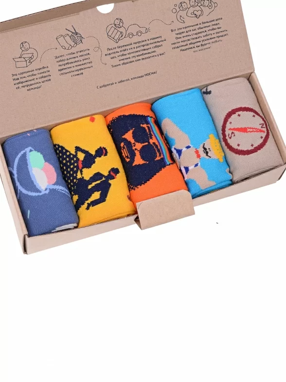 Носки аккуратными рулончиками без фабричных этикеток упакованы в плотную крафтовую коробку, которая в целях бережного отношения к природе отправляется без дополнительной транспортной упаковки.