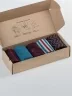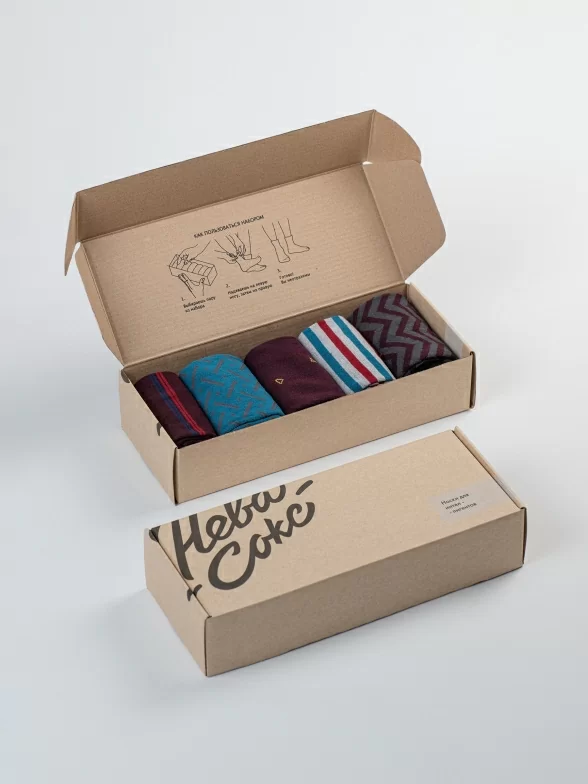 Носки без фабричных этикеток компактно свернуты рулончиками в стильной крафтовой коробке, которая в целях бережного отношения к природе отправляется без дополнительной транспортной упаковки.