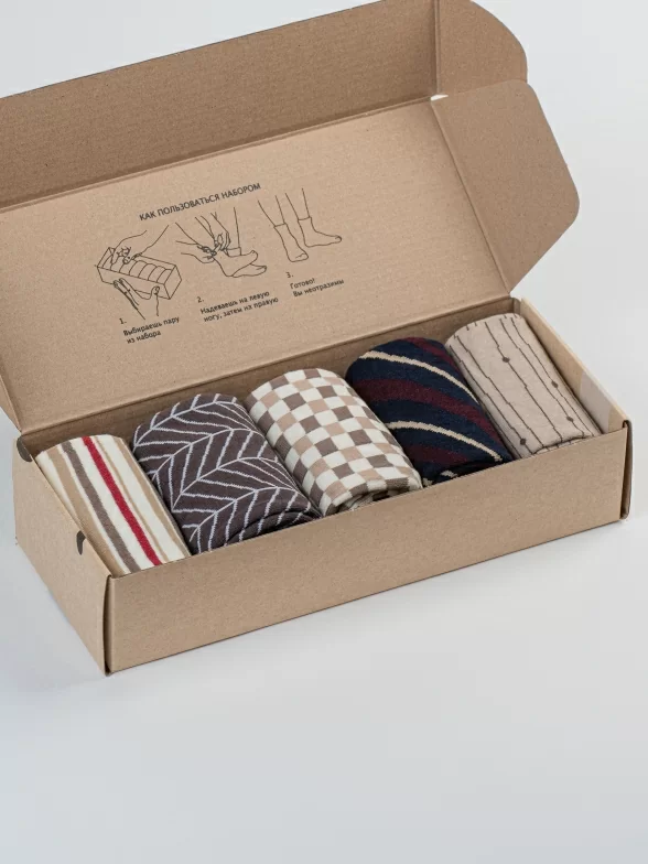 Носки без фабричных этикеток компактно свернуты рулончиками в стильной крафтовой коробке, которая в целях бережного отношения к природе отправляется без дополнительной транспортной упаковки.