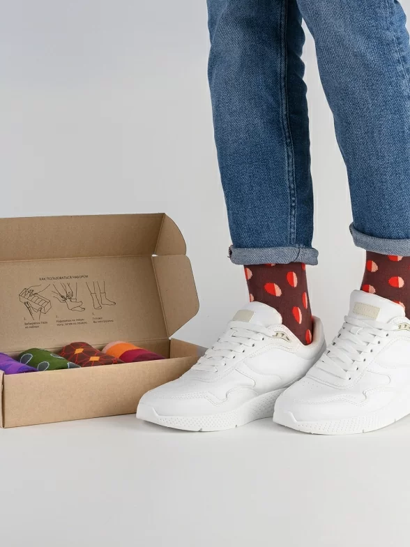 Дизайнерские носки с различными геометрическими принтами подойдут на каждый день и в качестве акцента к деловому образу.