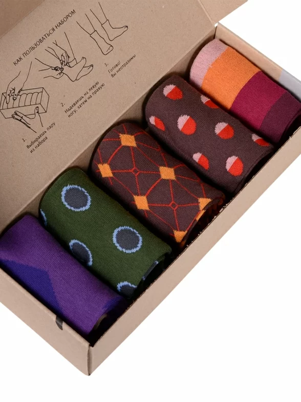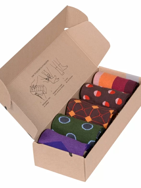 Носки без фабричных этикеток компактно свернуты рулончиками в стильной крафтовой коробке, которая в целях бережного отношения к природе отправляется без дополнительной транспортной упаковки.