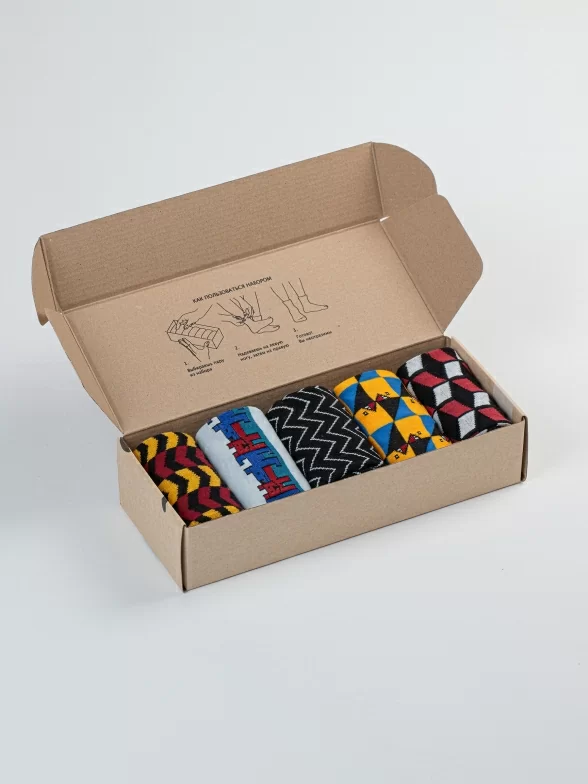 Носки без фабричных этикеток компактно свернуты рулончиками в стильной крафтовой коробке, которая в целях бережного отношения к природе отправляется без дополнительной транспортной упаковки.