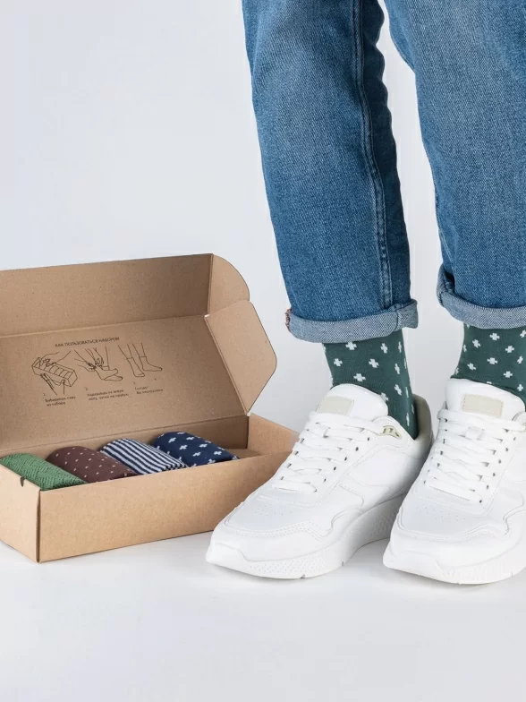 Носки без фабричных этикеток компактно свернуты рулончиками в стильной крафтовой коробке, которая в целях бережного отношения к природе отправляется без дополнительной транспортной упаковки.