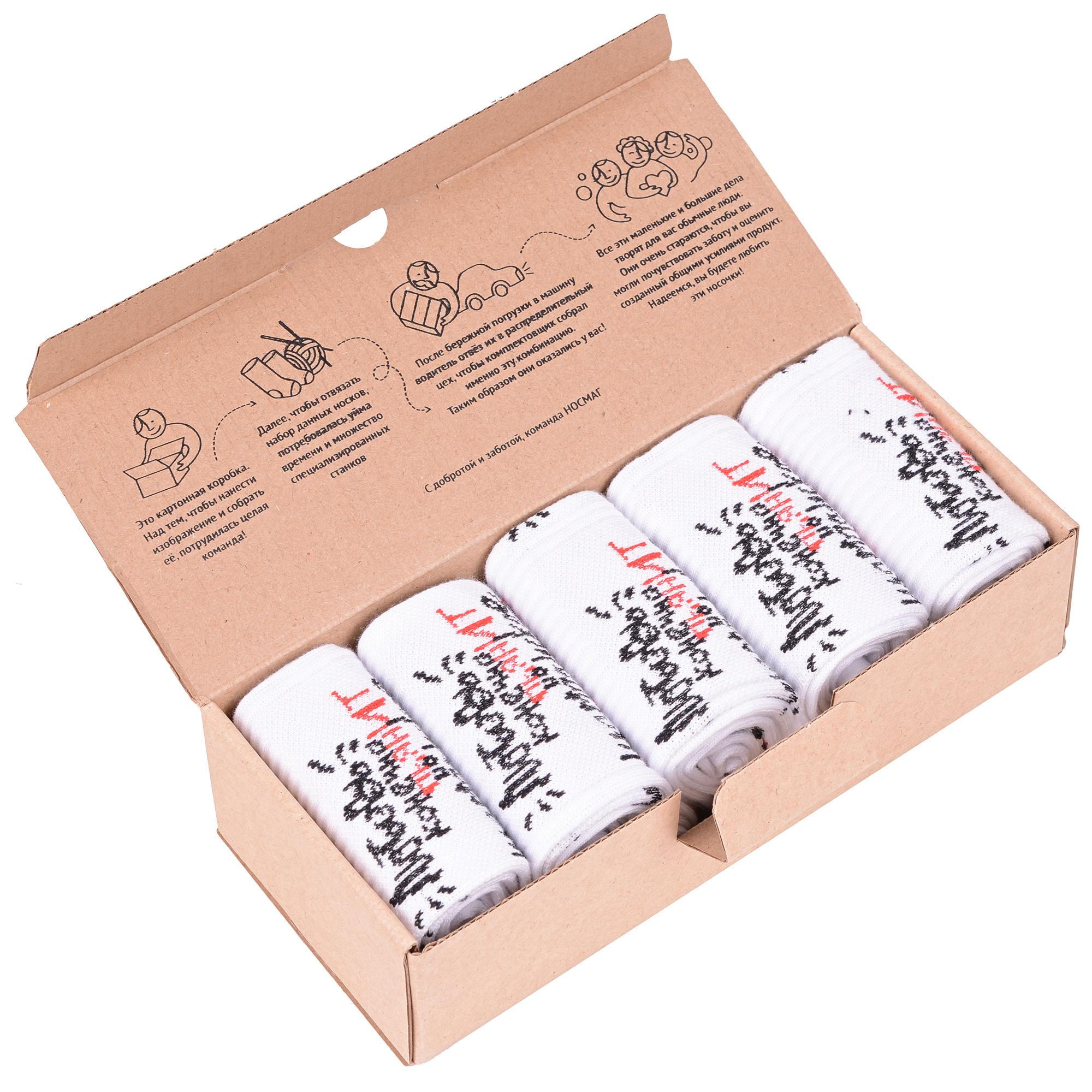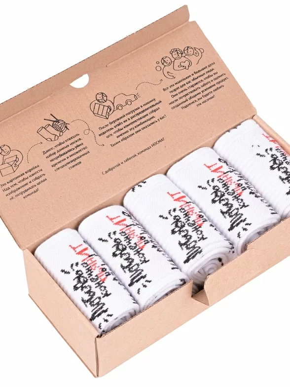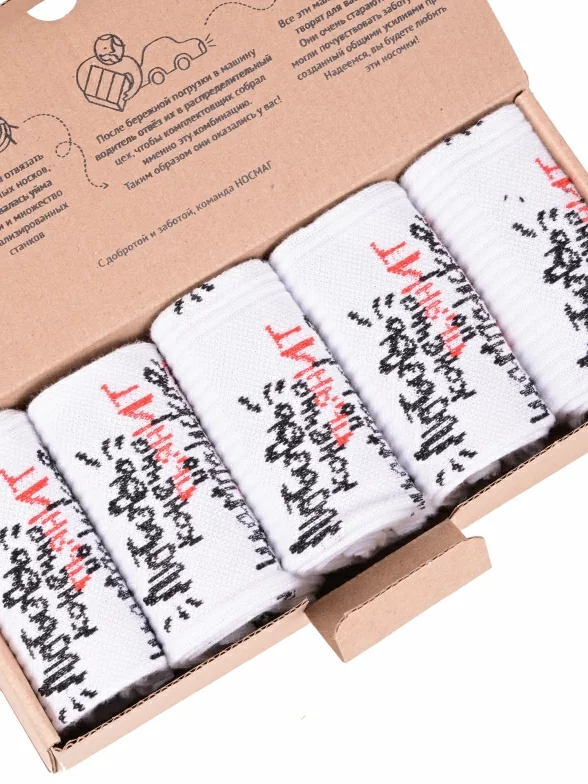 Без фабричных этикеток носки компактно уложены внутри фирменной коробки, которая дополнительно упакована в плотный пакет для бережной транспортировки.