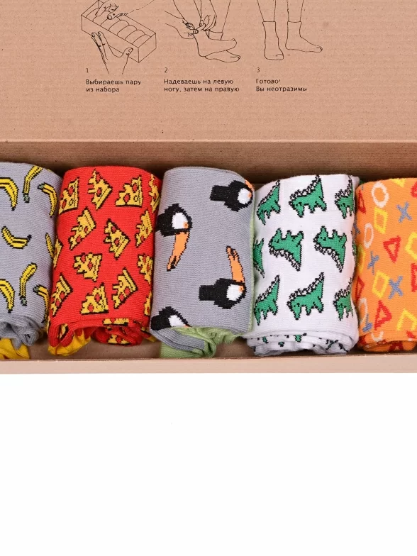 Носки без фабричных этикеток компактно свернуты рулончиками внутри крафтовой фирменной коробки, которая в целях бережного отношения к природе отправляется без дополнительной упаковки.