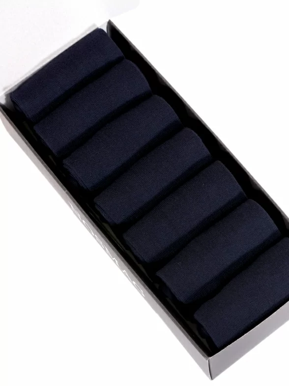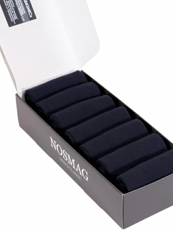 В набор входит 7 пар однотонных темно-синих мужских носков бренда RuSocks. Модель средней длины высокой плотности вязки, отличаются одинарным бортом (манжетом резинки) и неощутимым швом!