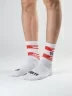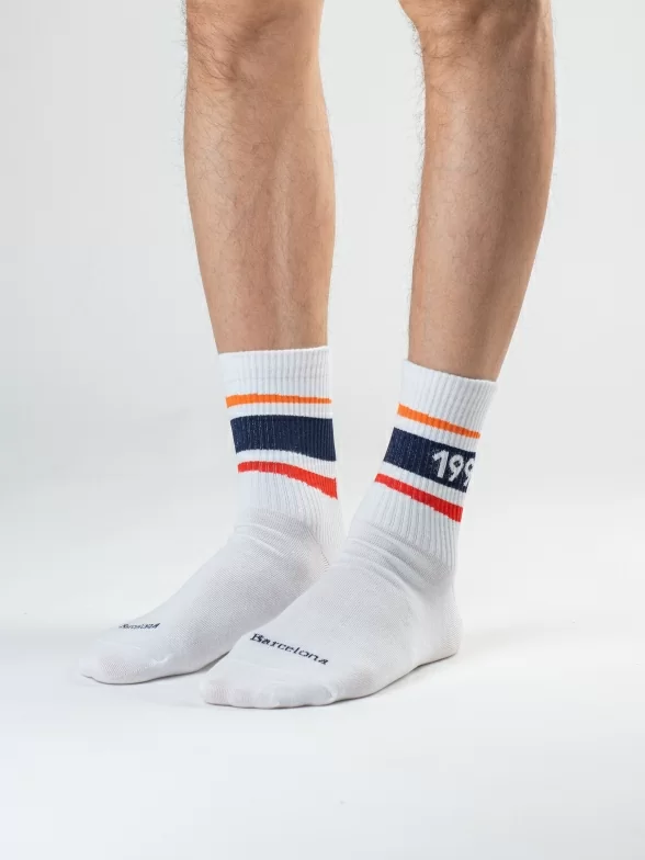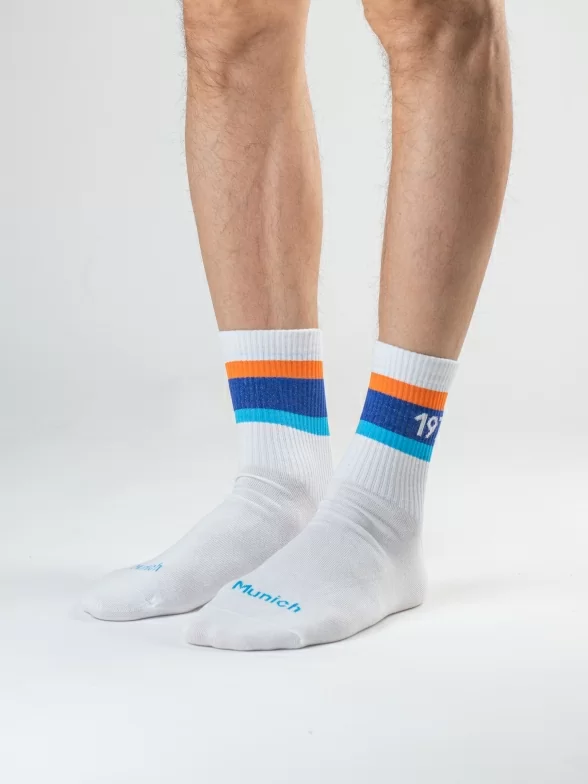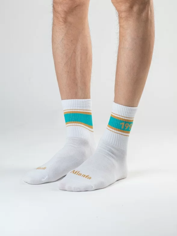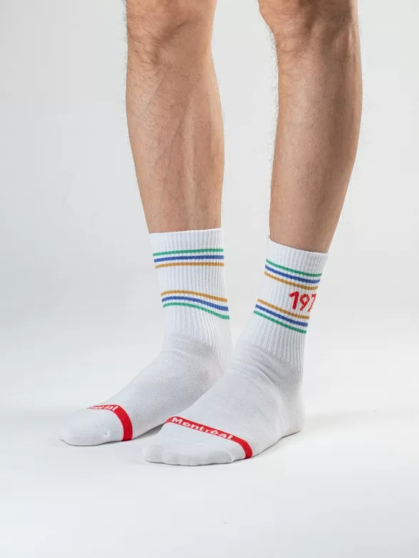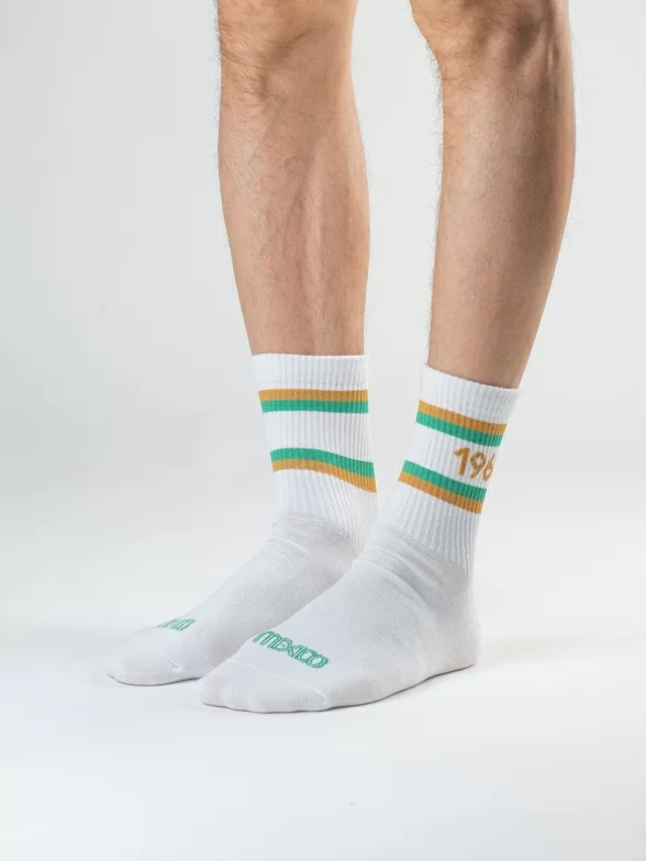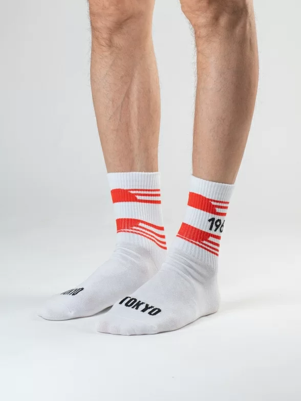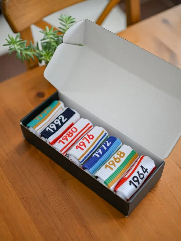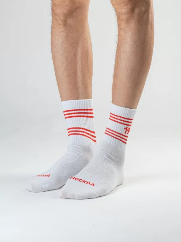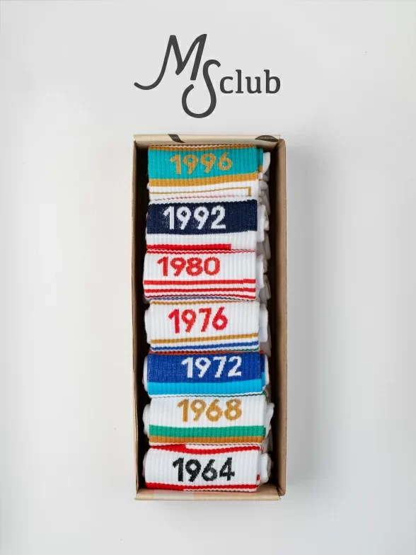 Все носки белого цвета укороченной длины с ощутимым уплотнением в месте шва на мыске; паголенок связан в рубчик. На каждой паре имеется контрастная полоса с своим годом проведения Олимпиады и на мыске вывязано название города, в котором она проводилась.