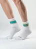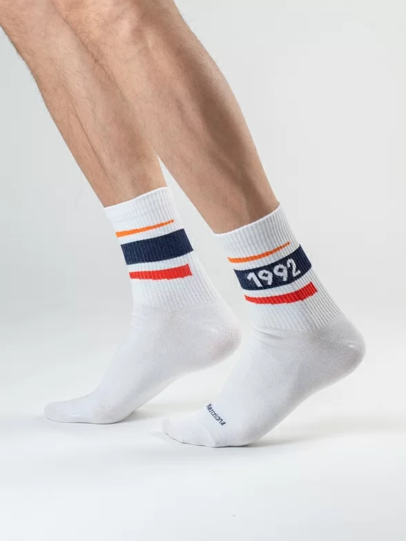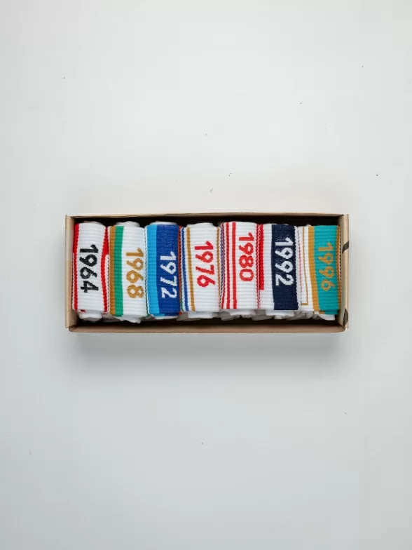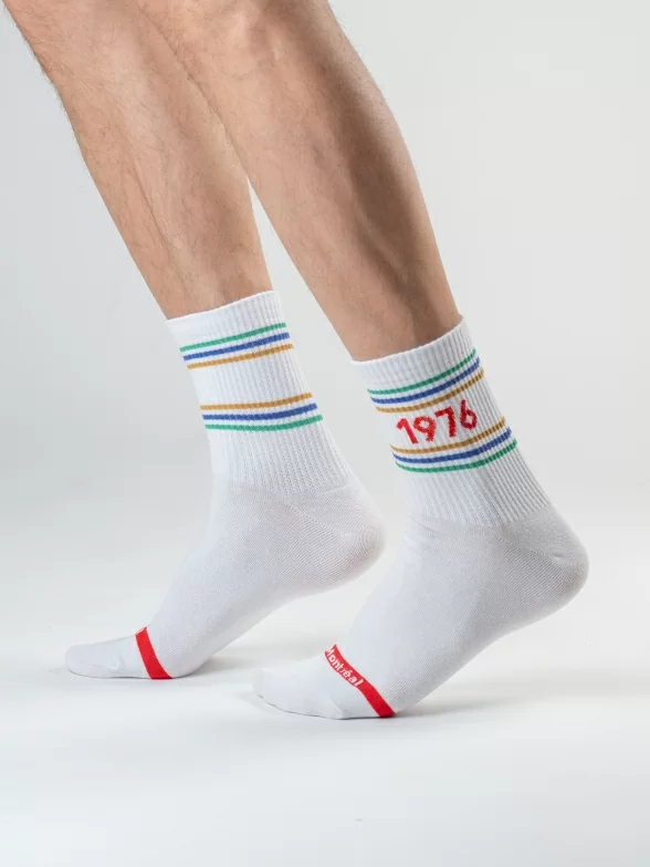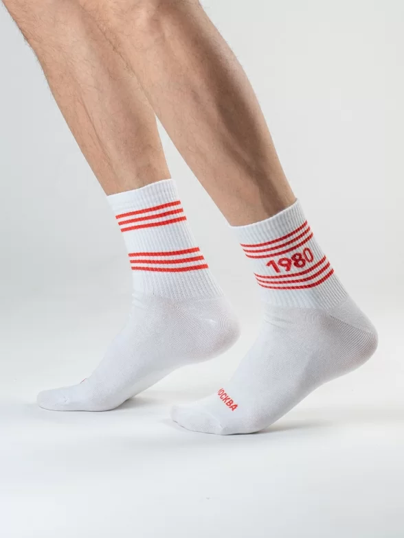 Все носки белого цвета укороченной длины с ощутимым уплотнением в месте шва на мыске; паголенок связан в рубчик. На каждой паре имеется контрастная полоса с своим годом проведения Олимпиады и на мыске вывязано название города, в котором она проводилась.