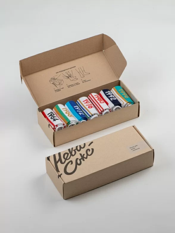 Носки компактно свернуты в аккуратные рулончики внутри лаконичной фирменной черной коробки. Для сохранности внешнего вида при транспортировке набор упаковывается в плотный картон.