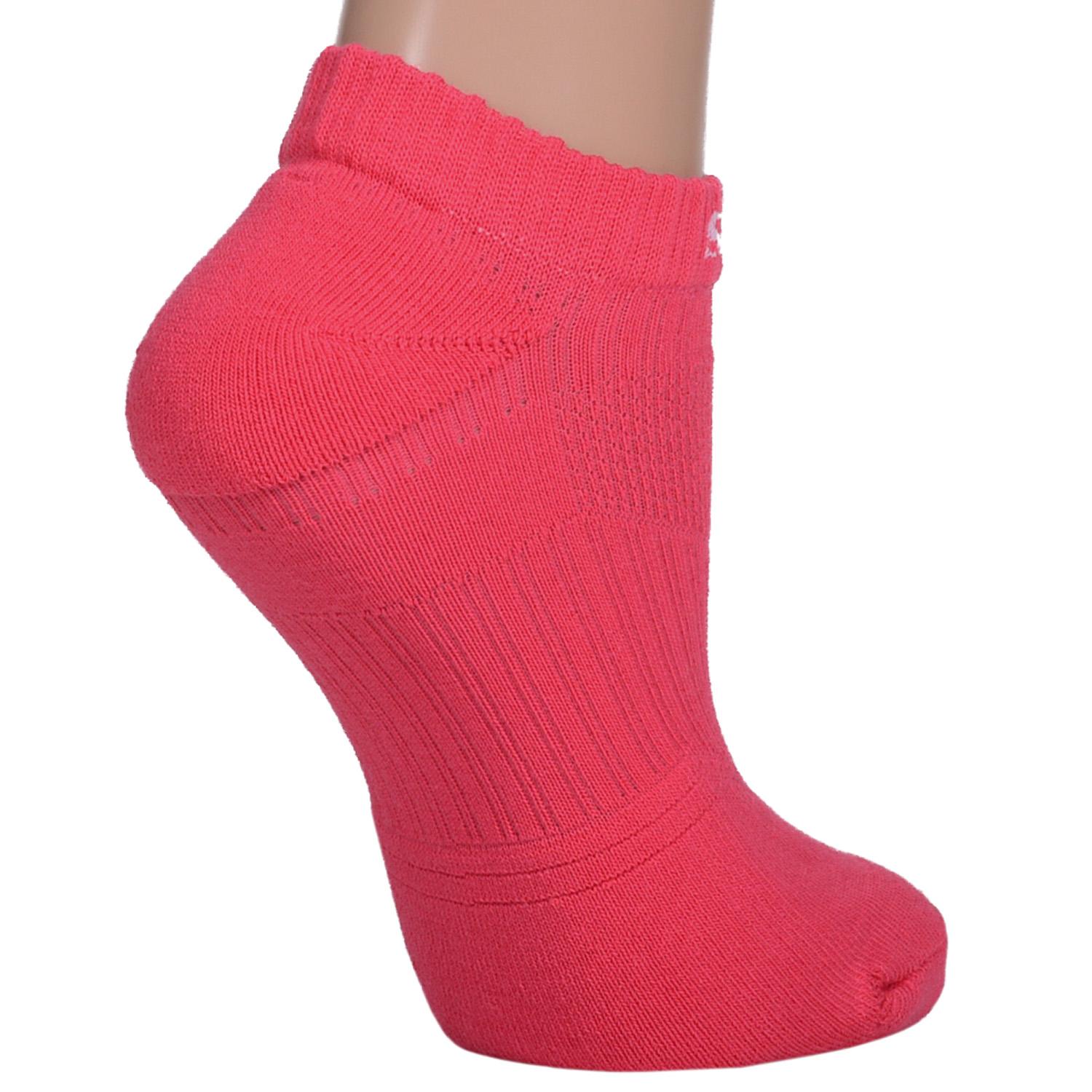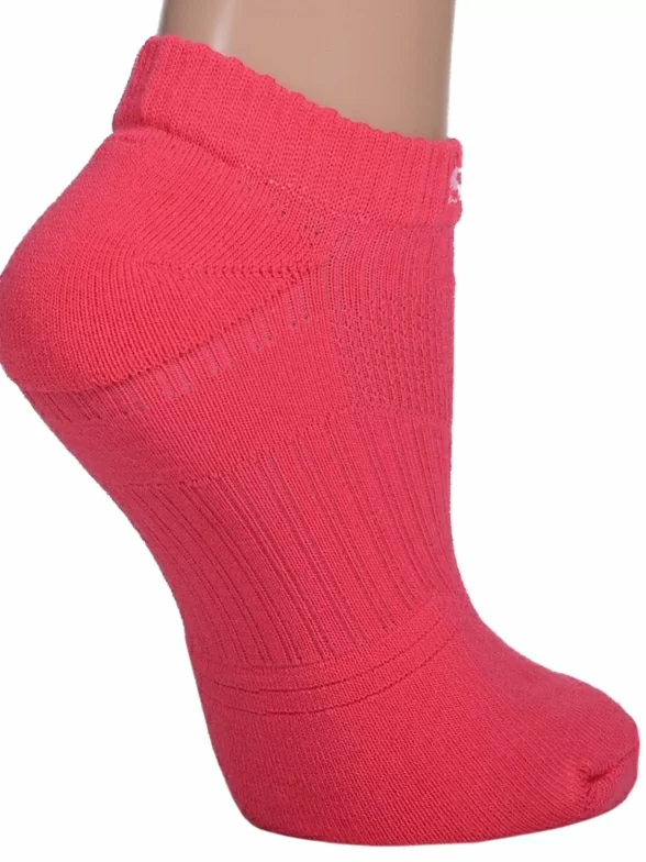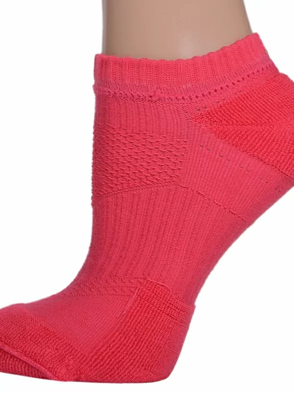 - Короткая модель малинового цвета имеет спортивную резинку, специальную вставку в рубчик вокруг стопы для лучшей фиксации носка на ноге, сеточку на подъеме, а также махровые пятку и мысок.