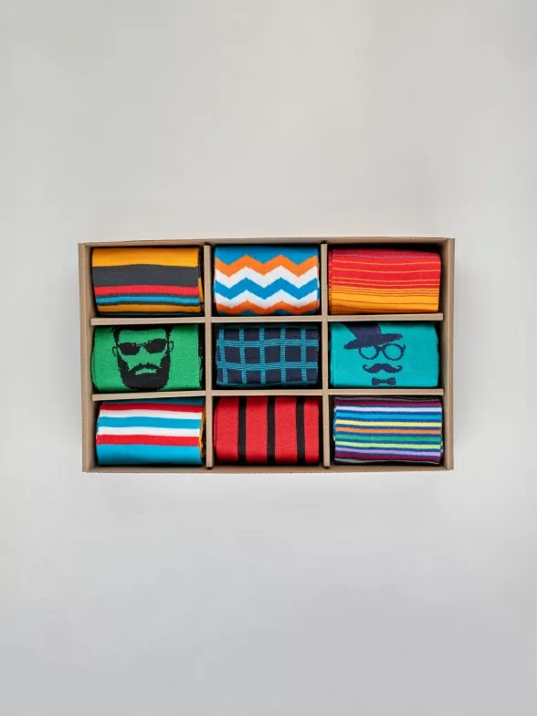 В этот набор "Барбер" входит 9 пар мужских носков с различными геометрическими принтами, которые подойдут для любого повседневного образа.
