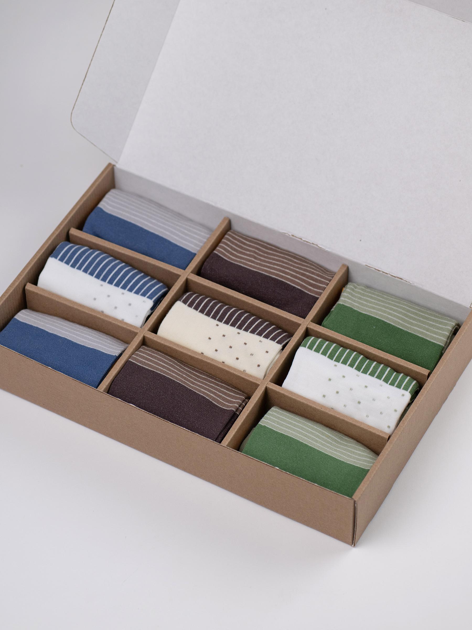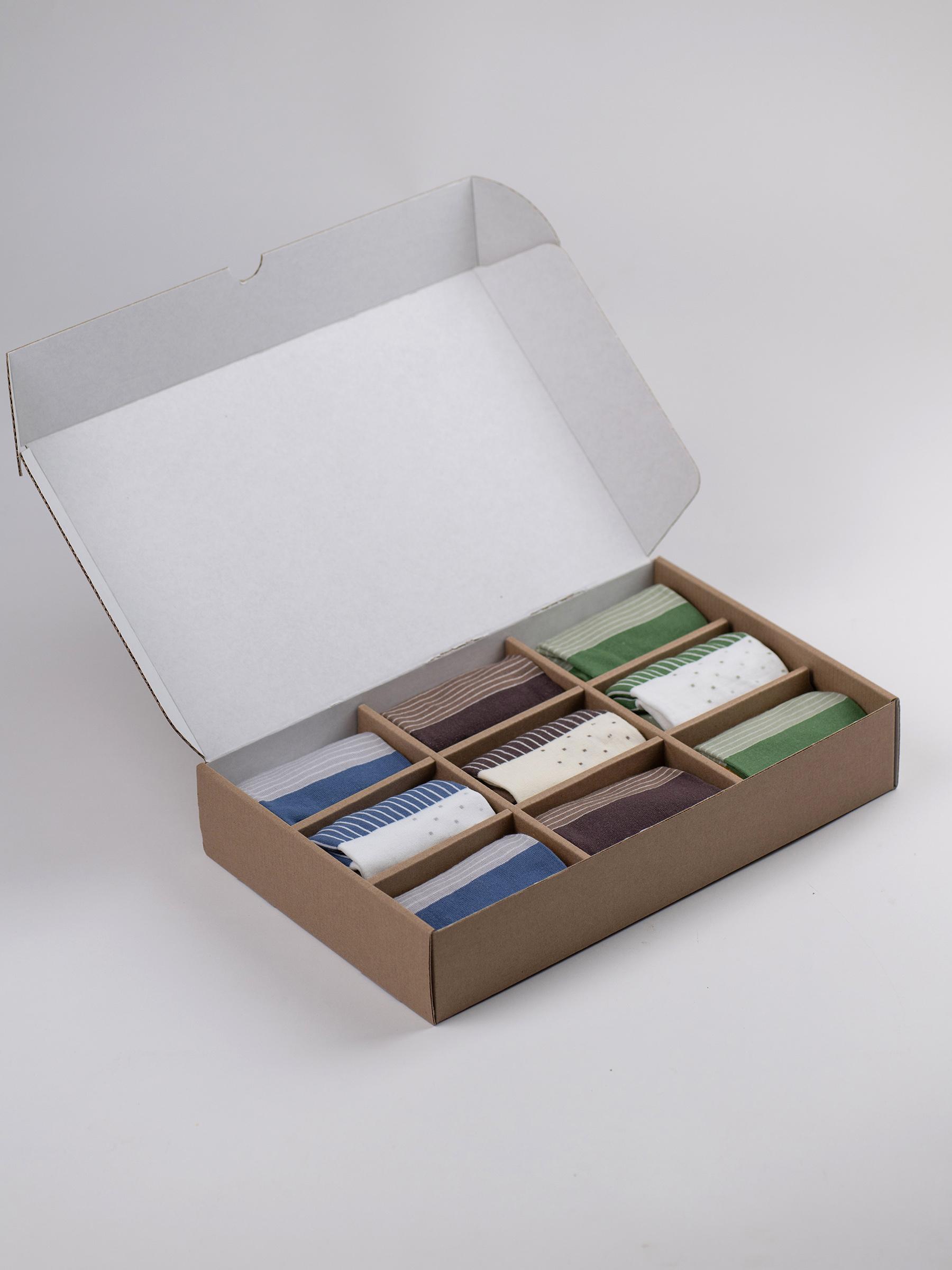 В этот набор входит 9 пар мужских носков с различными геометрическими принтами, которые подойдут для любого повседневного образа.